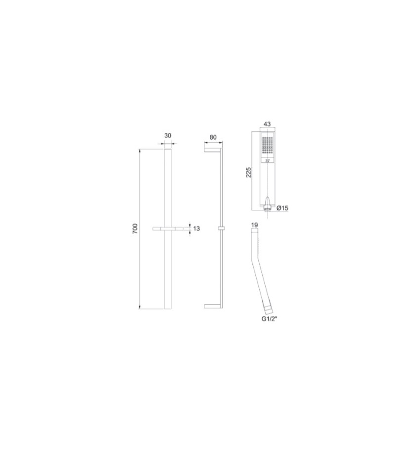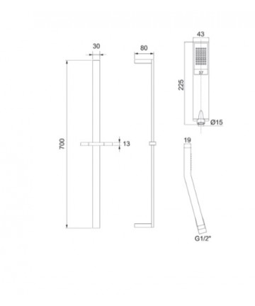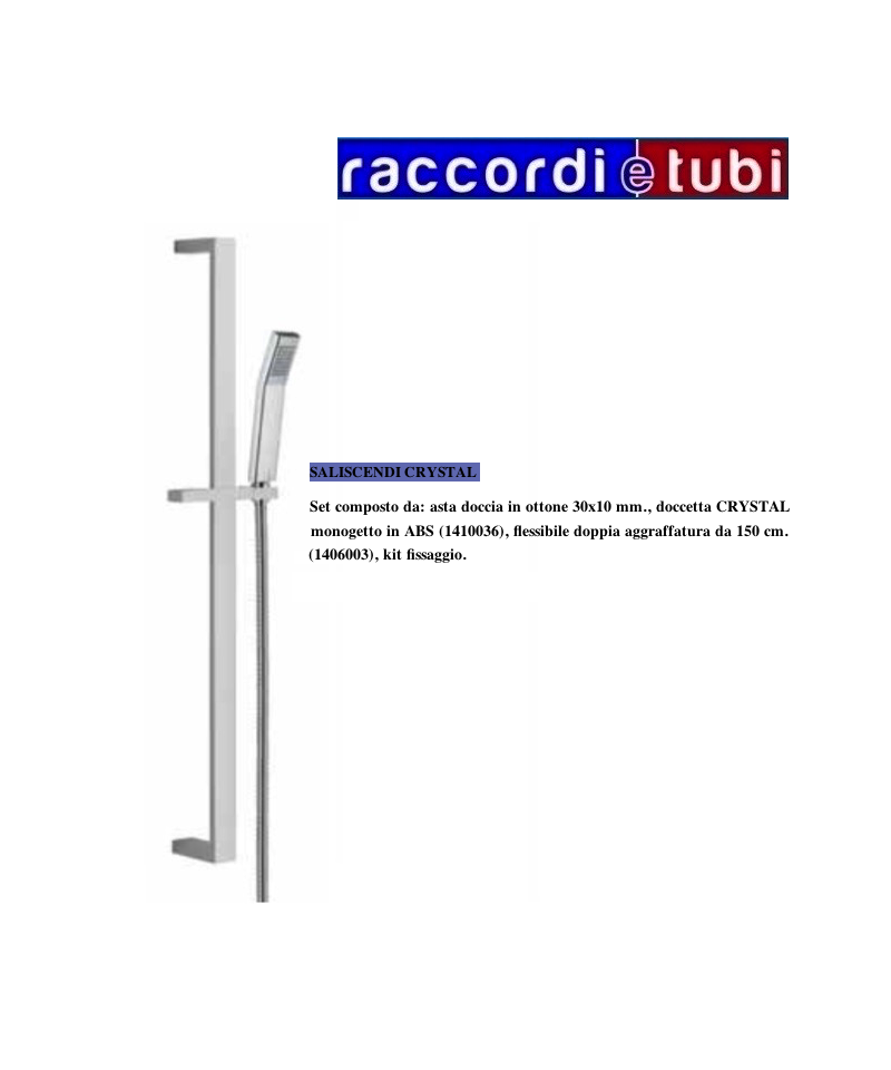 Set bestehend aus: Duschstange aus Messing 30x10 mm., CRYSTAL Einstrich-Duschkopf aus ABS (1410036), flexibler Schlauch doppelt genoppt 150 cm. (1406003), Befestigungsset.