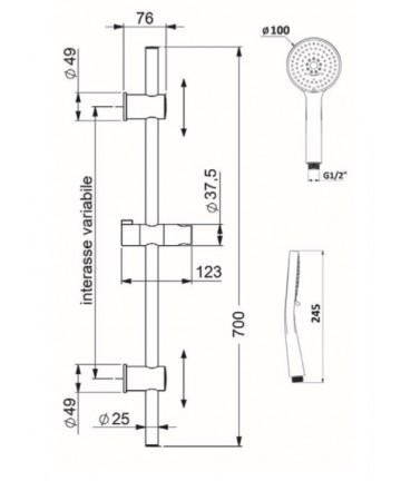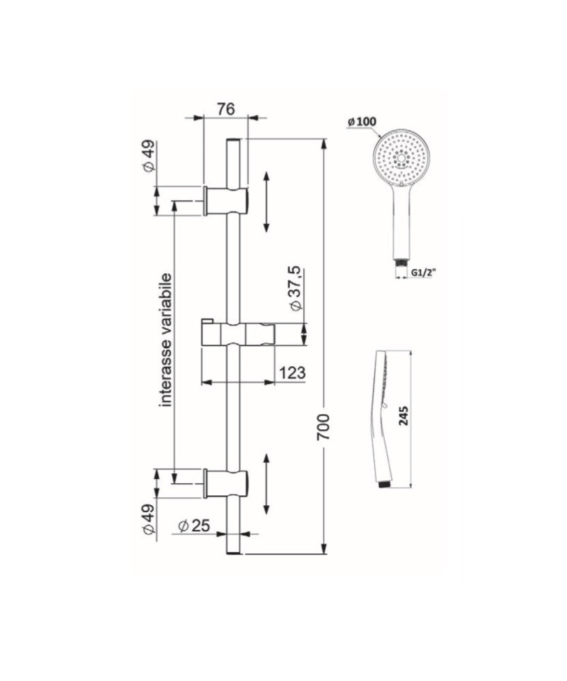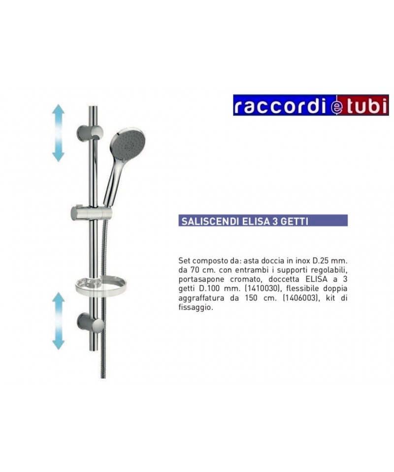 Set bestehend aus: Duschstange aus Edelstahl D.25 mm. mit 70 cm. und beiden verstellbaren Halterungen, chromierter Seifenablage, ELISA Handbrause mit 3 Strahlarten D.100 mm. (1410030), flexiblem Schlauch mit doppelter Verpressung von 150 cm. (1406003), Montagekit.