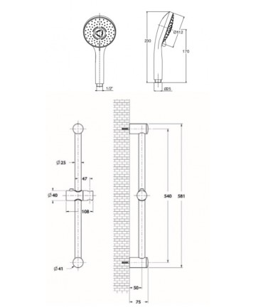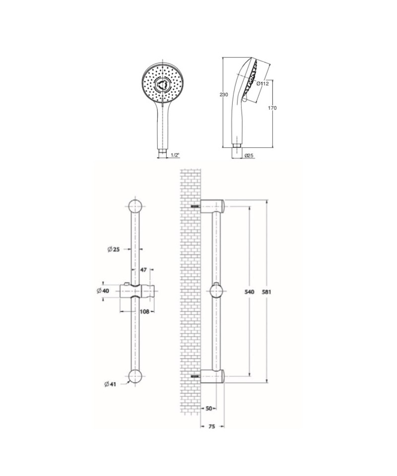 Set bestehend aus: Duschstange aus Edelstahl D.25 mm. von 58 cm., chromierter Seifenspender, DIANA Handbrause mit 5 Strahlen D.112 mm. (1410034), flexibler Schlauch mit doppelter Verpressung von 150 cm. (1406003), Befestigungsset.