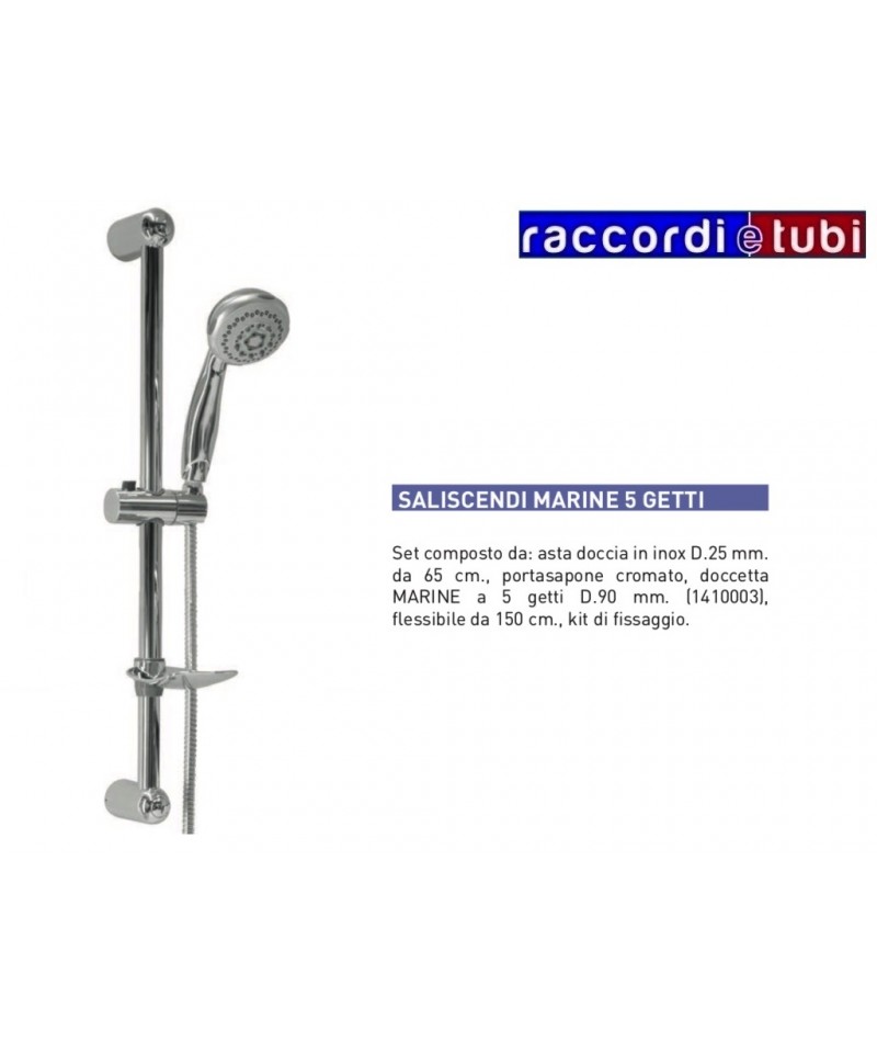 Set bestehend aus: Duschstange aus Edelstahl D.25 mm. mit 65 cm, chromierten Seifenspender, MARINE Handbrause mit 5 Strahlen D.90 mm. (1410003), flexibler Schlauch von 150 cm, Montageset.