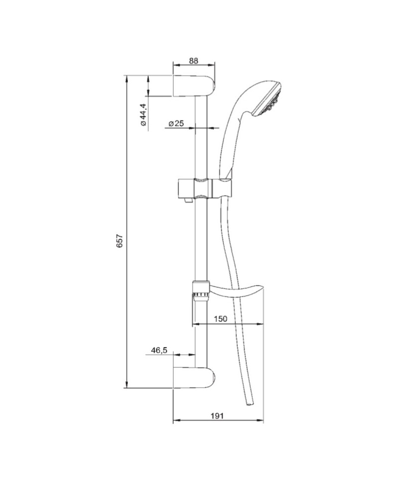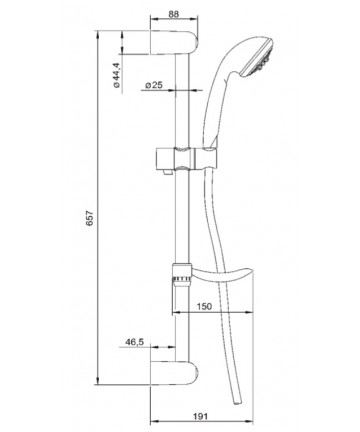 Set bestehend aus: Duschstange aus Edelstahl D.25 mm. mit 70 cm. und beiden verstellbaren Halterungen, chromierter Seifenablage, ELISA Handbrause mit 3 Strahlarten D.100 mm. (1410030), flexiblem Schlauch mit doppelter Verpressung von 150 cm. (1406003), Montagekit.