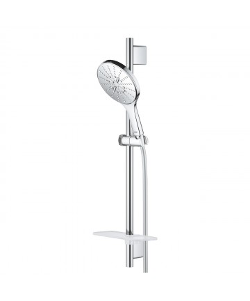Warum nicht Ihrer Dusche mit der schlanken und eleganten GROHE Rainshower 150 SmartActive Dusche einen sofortigen Qualitäts-Schub geben, ausgestattet mit einem großzügigen Duschkopf mit einem Durchmesser von 150 mm? Mit der Zuverlässigkeit von Made in Germany, kommt sie mit einem TwistFree Silverflex Schlauch (1750 mm), einer Stange (600 mm) und dem GROHE EasyReach Ablagefach zur Organisation des Duschraums. Sie bietet auch zahlreiche innovative Technologiefunktionen. GROHE SmartTip, ein ergonomisch gestaltetes Steuergerät auf der Rückseite des Hebels, sorgt für die Kontrolle des Strahltyps mit den Fingerspitzen: der lebendige GROHE ActiveMassage, der neue Standard für revitalisierende Massagen, der belebende Jet und der sanfte Rain, zart wie ein leichter Sommerregen. Wenn Sie das Wasser abstellen, minimiert GROHE DripStop lästige Tropfen mit den Rain- und Jet-Strahlen. Dank GROHE DreamSpray ist der Fluss aus jeder Düse perfekt ausgewogen für maximale Zufriedenheit. Und die SpeedClean Kalkschutzdüsen sind ebenfalls sehr leicht zu reinigen. Die GROHE EcoJoy-Funktion, die den Wasserfluss auf 9,5 l/min begrenzt, ohne die Leistung zu beeinträchtigen, ist durch die kratzfeste GROHE StarLight-Beschichtung (Chrom) geschützt, die jahrelang glänzend bleibt. Schließlich verhindert das Inner WaterGuide-System (Innere Wasserkanalisolierung) eine Überhitzung der Oberfläche und schützt sowohl empfindliche Haut als auch die Verchromung. Die Installation ist unglaublich einfach: Das GROHE QuickFix Plus-System ermöglicht die Nutzung vorhandener Löcher, während GROHE TileFix die notwendige Flexibilität gewährleistet, um die Tiefe der Stange anzupassen, um den richtigen Abstand zu erreichen und eine perfekte Installation auch in nur teilweise gefliesten Bädern zu erzielen. Mit dem GROHE Rainshower 150 SmartActive Duschset trifft modernes schlankes Design auf luxuriöse Leistung!
