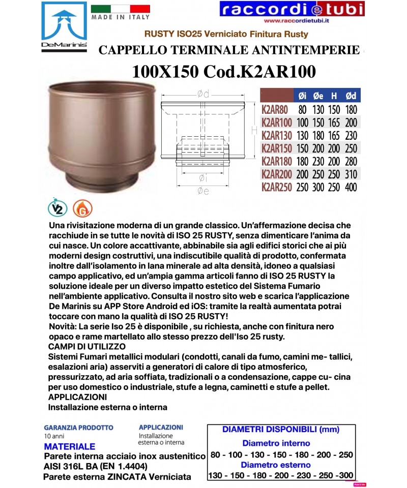 Modulare Elemente mit doppeltem Wandssystem ISO 25 RUSTY, mit Qualität und Oberflächenbehandlung der äußeren Wand in "Rusty" für De Marinis S.r.l., hergestellt mit einer inneren Wand aus Edelstahl AISI 316 L mit einer Mindeststärke von 0,4 mm und einer äußeren Wand aus verzinktem Blech mit einer Dicke von 0,5 mm, die den in der europäischen CE-Kennzeichnung gemäß der Norm EN 1856-1:2009 vorgesehenen Standards entsprechen und die Bezeichnung T200-P1-W-V2-L50040-O40 für Anwendungen mit Dichtung haben, alternativ für Anwendungen ohne Dichtungsring, mit der Bezeichnung T600-N1-W-V2-L50040-G85 gemäß denselben oben beschriebenen Standards. Die Isolierung besteht aus hochdichter mineralischer Wolle mit einer Dicke von 25 mm, gepresst und zwischen die Wände ohne Verbindungselemente dazwischen (Wärmebrücke) eingeklemmt.