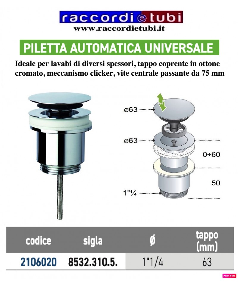 Click-Mechanismus, abdeckender Stöpsel, Durchgangsschraube für Waschbecken mit einer Dicke von bis zu 60 mm. Metallstöpsel D.63