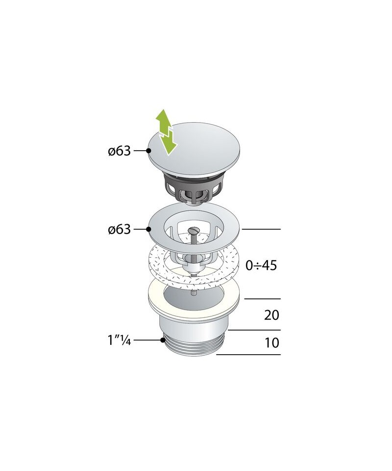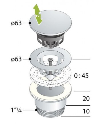 Clicker-Mechanismus, abdeckender Stopfen, Durchgangsschraube für Waschbecken mit einer Dicke von bis zu 60 mm. Metallstopfen D.63