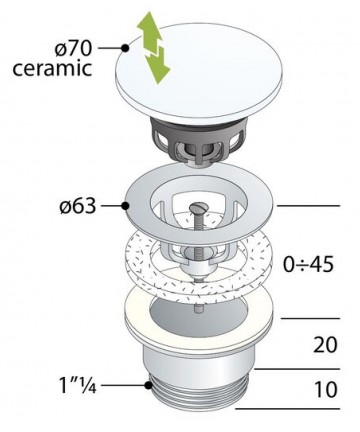 Clicker-Mechanismus, Abdeckkappe, Durchgangsschraube für Waschbecken mit einer Dicke von bis zu 60 mm. Keramikkappe D.70.