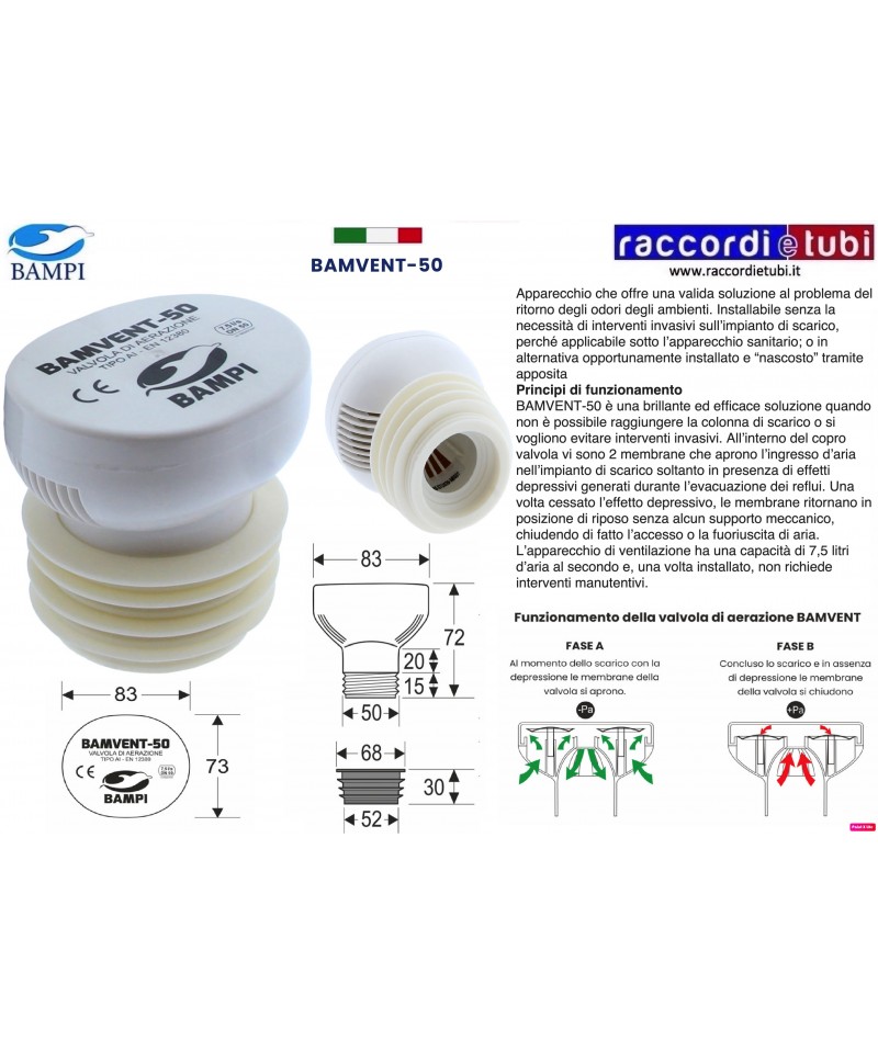 Das Ventil BAMVENT-50 kann nur in vertikaler Position auf Rohren mit einem Durchmesser von 32-40-50-63 mm montiert werden, da es einen speziellen Halteclip hat. Es wird empfohlen, immer einen Zugang zum Gerät vorzusehen, um gegebenenfalls Inspektionen durchzuführen, obwohl das Produkt keine Wartungsarbeiten erfordert.