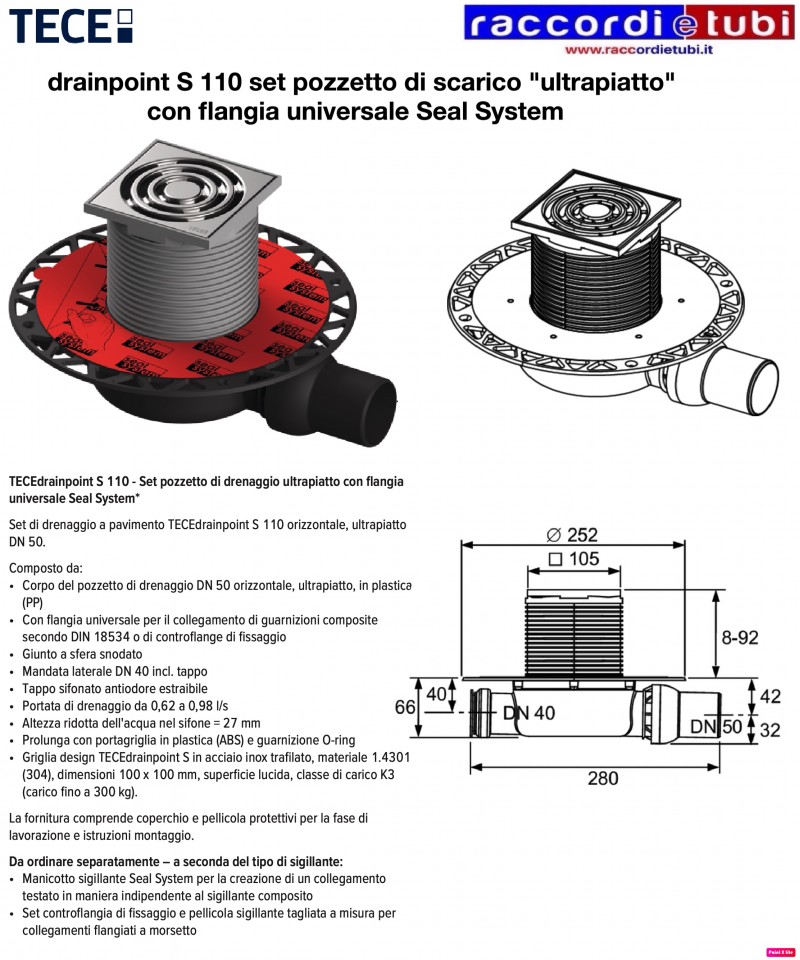 MINIFLOW QUADRAT SIFON mm.110X110 TEA OMP VOLLSTÄNDIG MIT TUCH