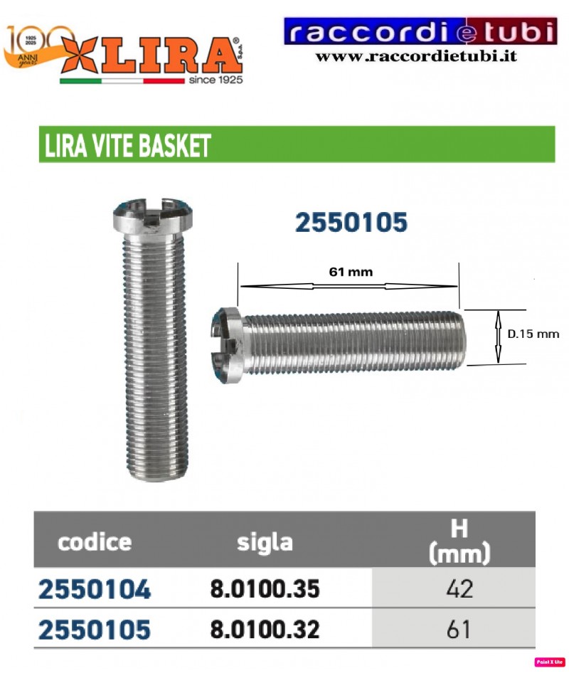 VERLÄNGERUNGSSCHRAUBE FÜR LIRA-BEISTEUERUNG MÜNZSCHNEIDUNG HÖHE mm.61 DURCHMESSER GEWINDE mm.15