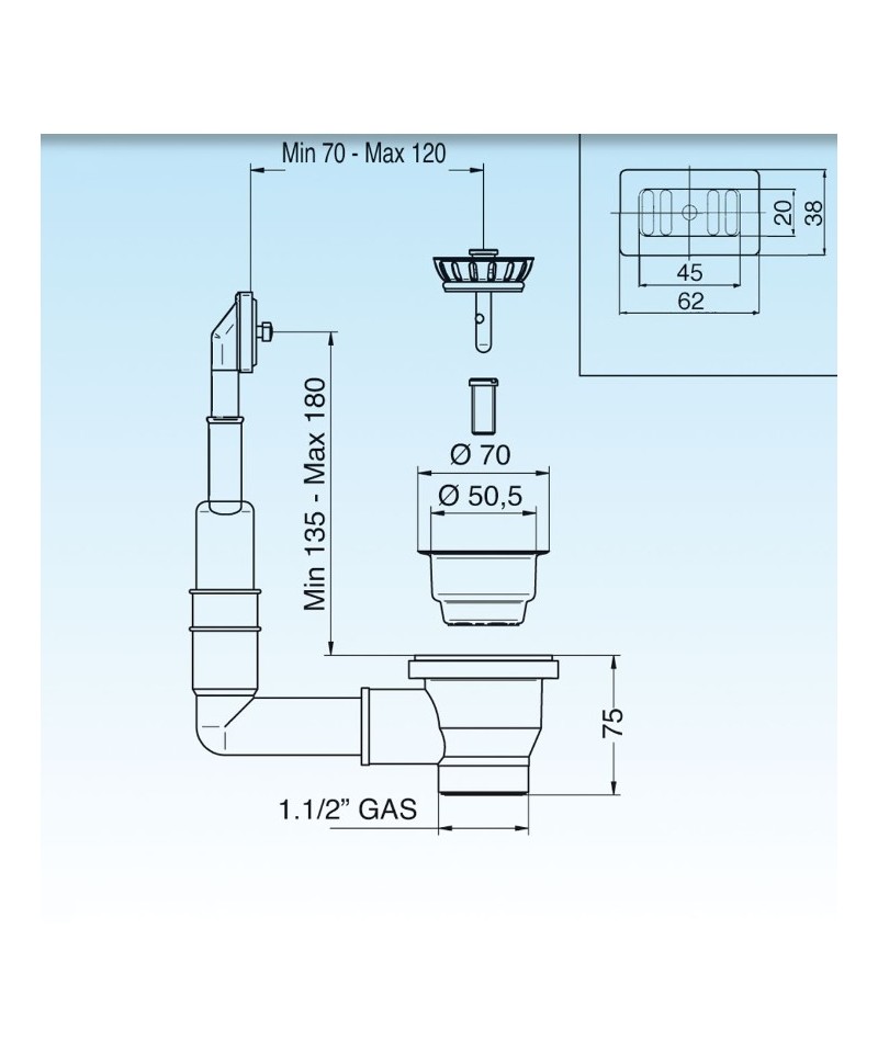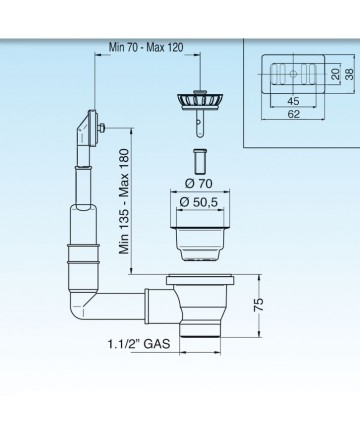 PP-TRAPPE FÜR EDELSTAHLSPÜLEN 11/2''x70 OHNE ÜBERLAUFAUSLASS DECKEL mm.45,5