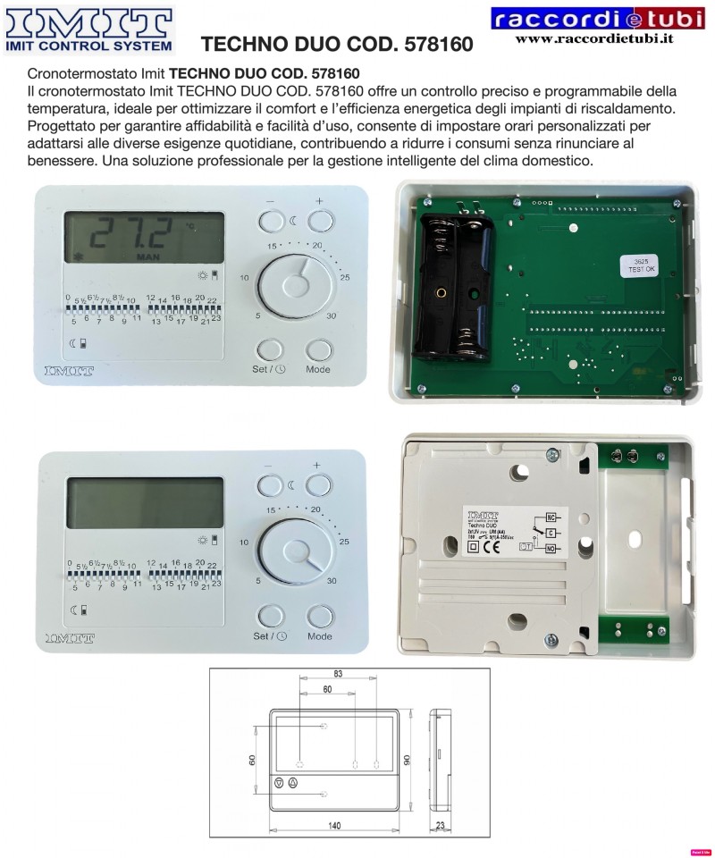 Der Kronthemostat Imit TECHNO DUO COD. 578160 bietet eine präzise und programmierbare Temperaturkontrolle, ideal zur Optimierung des Komforts und der Energieeffizienz von Heizungsanlagen. Entwickelt, um Zuverlässigkeit und Benutzerfreundlichkeit zu gewährleisten, ermöglicht er das Einstellen individueller Zeiten, um sich den verschiedenen täglichen Bedürfnissen anzupassen und den Verbrauch zu senken, ohne auf das Wohlbefinden zu verzichten. Eine professionelle Lösung für das intelligente Management des häuslichen Klimas.