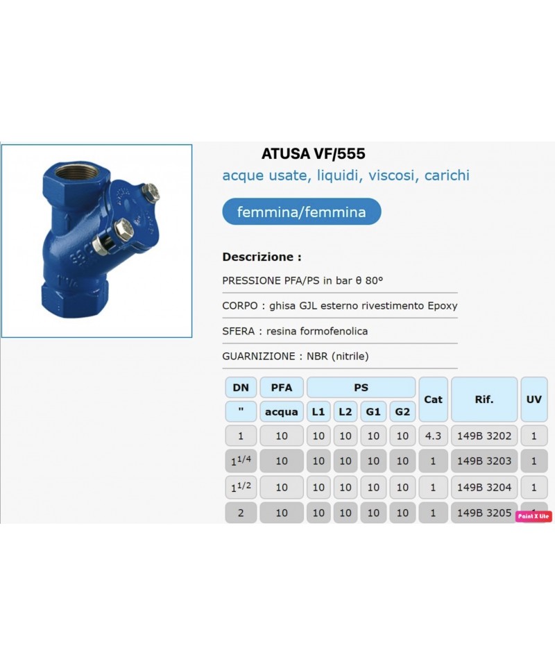 Gehäuse: GG25 Guss mit Epoxidbeschichtung. Kugel: phenolharz. Dichtung: NBR. Maximale Temperatur: 80°C. Betrieb mit horizontalem oder vertikal steigendem Durchfluss. Anwendungen: Abwasser, viskose Flüssigkeiten, Lasten.