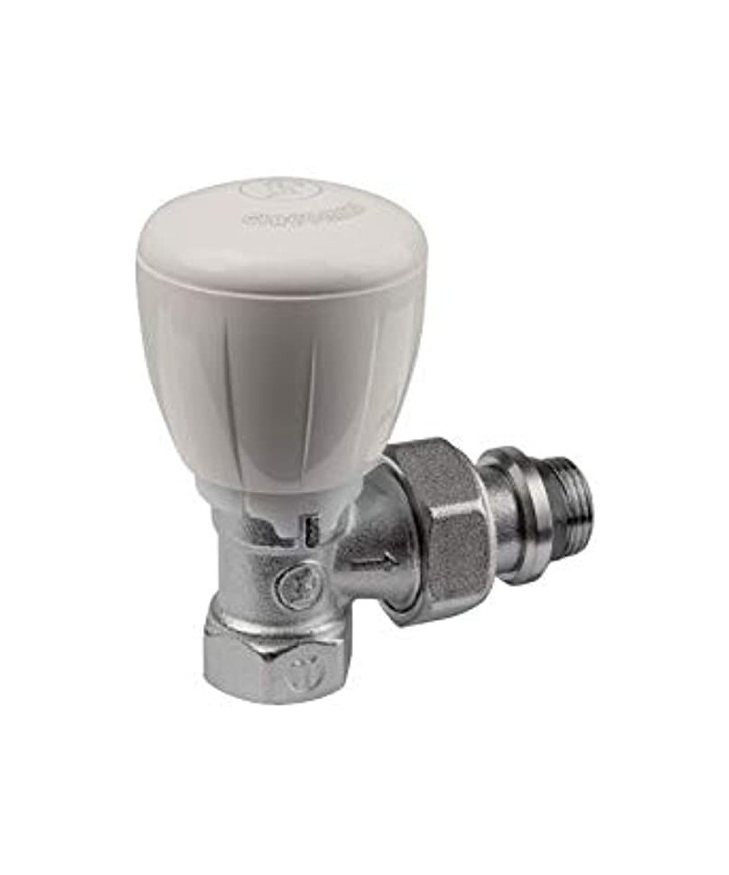 Mikrometrisches, thermostatisierbares Winkelventil aus verchromtem Messing mit Anschluss für Kupfer-, Kunststoff- oder Mehrschichtrohre.