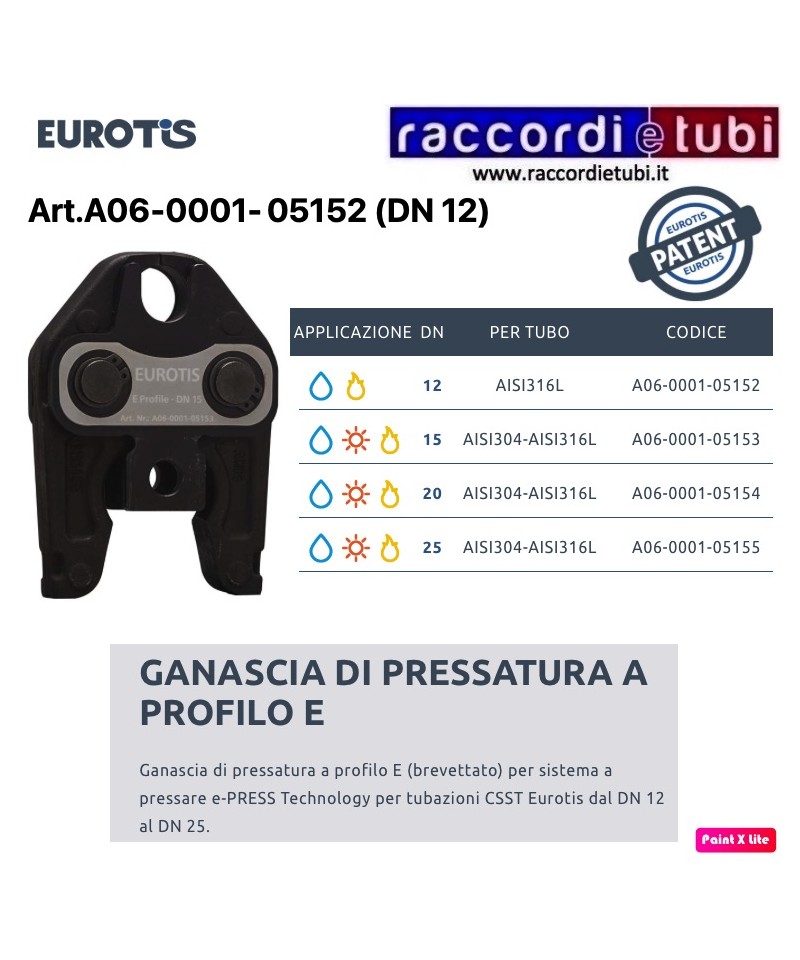 Patentierte Druckbacke Profil E für das Presssystem e-PRESS Technology für CSST-Rohre Eurotis DN 12