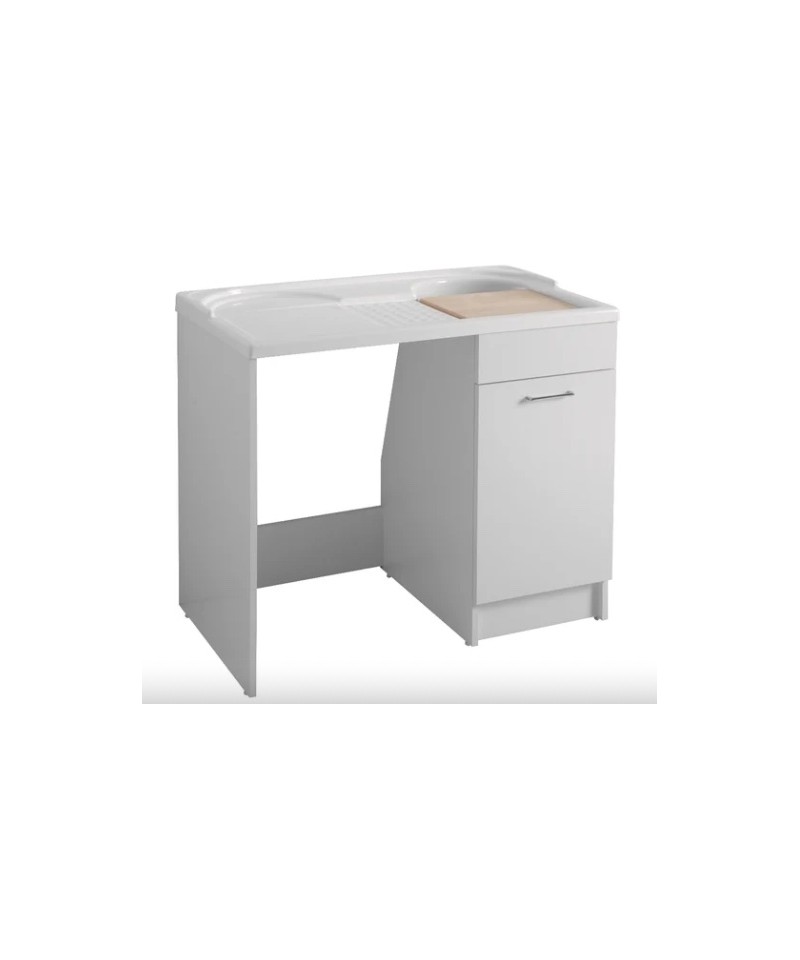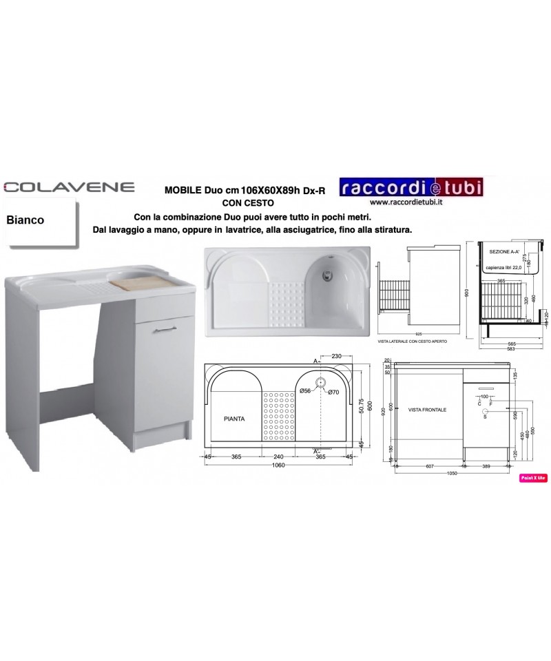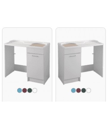 Eigenschaften: Mobiliar aus 18 mm beschichteter Spanplatte. Wasserabweisend nach EN-Norm, Front in hochglänzendem Laminat. Ausstattung: geliefert mit Wäschekorb und Gitter, Tisch aus Massivholz, Waschbecken aus ABS-Methacrylat, Siphon und Überlauf, verchromte Griffe.