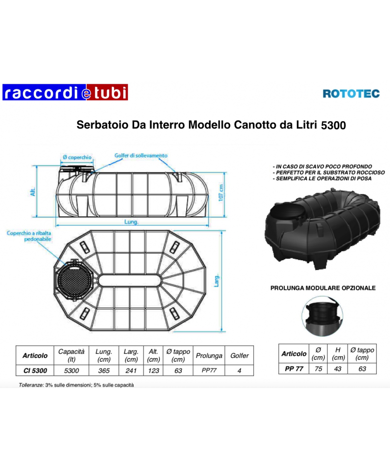 Material: Erdbehälter aus einem einzigen Stück gewelltem Polyethylen niedriger Dichte (LLDPE) glatt mit einem Eingangsrohr aus PVC mit Gummidichtung N.B.R., Tauchpumpe für Abwasser verbunden mit einem Ausgangsrohr aus Polyethylen. Die Pumpe ist mit einem Schwimmer für automatische Ein/Aus-Steuerung ausgestattet.