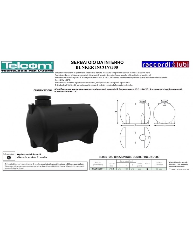 TECHNISCHE DATENBLATT ERDBECKEN Mod. CORUGATO Material: Erdbohrbehälter aus einem Stück aus hochdichtem linearem Polyethylen (LLDPE), ausgestattet mit einer Schraub- oder Klappinspektionsklappe, je nach Modell. Funktion: Behälter für die Lagerung von Trink- und Regenwasser. Die hohe Widerstandsfähigkeit und die geringe Reaktivität des hochdichten linearen Polyethylens ermöglichen die Verwendung der Behälter für die Aufnahme verschiedener Arten von Flüssigkeiten (siehe Kompatibilitätsdatenblatt des PE mit Flüssigkeiten). Gebrauch und Wartung: Die Zisternen sind nicht dem Zeitablauf unterworfen, und die verwendeten Materialien gewährleisten maximale Zuverlässigkeit in Bezug auf Korrosions- und Oxidationsprobleme. Die monolithische Struktur gewährleistet Robustheit und Festigkeit, da keine Schweißnähte vorhanden sind, die die Teile, die inneren Spannungen ausgesetzt sind, schwächen könnten. Für Installationszwecke ist es möglich, Löcher in den Behältern an den entsprechenden Stellen zu bohren. Die glatten Oberflächen der Behälter ermöglichen eine einfache Wartung, das leichte Gewicht einen einfachen Transport und eine einfache Installation. Darüber hinaus liegen die Kosten deutlich unter denen von Metall, Beton und Polyesterharz. Modularität: Durch die Installation von Flanschverbindungen aus PE ist es möglich, mehrere Behälter zu verbinden, um hohe Lagerbestände zu erzielen. Verfügbare Farben: schwarz, marmoriertes grau. Installation: Befolgen Sie unbedingt die von ROTOTEC bereitgestellten „EINBAUMETHODEN“.