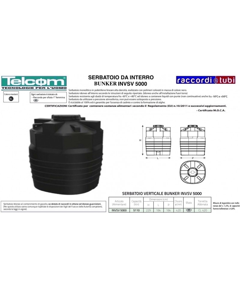 TECHNISCHE DATENBLATT AUSSENTANK (PANETTONE) VERTIGO Material: Außentanks aus einem Monoblock aus linearer Polyethylen (LLDPE), rotomoldet, ausgestattet mit einem PP-Schraubinspektionsdeckel mit Entlüftung, mit genormten Innengewinden für Einlass, Auslass und vollständige Entleerung. Funktion: Behälter, die zur Lagerung von Trink- und Regenwasser sowie anderen Lebensmitteln verwendet werden. Die hohe Beständigkeit und die geringe Reaktivität von hochdichtem Polyethylen ermöglichen die Nutzung der Tanks zurContainierung verschiedener Flüssigkeiten (siehe „Kompatibilitätsblatt von PE zu Flüssigkeiten“ auf der Website www.rototec.it). Technische Merkmale: Die Tanks halten Temperaturschwankungen von -20 °C bis 80 °C stand, sie sind nicht anfällig für Verschlechterungen im Laufe der Zeit, und die verwendeten Materialien gewährleisten maximale Zuverlässigkeit in Bezug auf Korrosions- und Oxidationsprobleme. Der Monoblockaufbau gewährleistet Robustheit und Solidität, da keine Schweißnähte vorhanden sind, die die Teile, die internen Spannungen ausgesetzt sind, schwächen könnten. Bei Installationsbedarf ist es möglich, Löcher an den entsprechenden Stellen in die Tanks zu bohren. Die glatten Oberflächen der Tanks ermöglichen eine einfache Wartung, das geringe Gewicht einen einfachen Transport und die Installation. Gebrauch und Wartung: Der Tank wird UNGEWASCHEN geliefert. Vor der ersten Verwendung sollte das Innere mit Wasser und Reinigungsmittel oder Spülmittel gewaschen und gegebenenfalls mit einem HACCP-Oberflächenreiniger behandelt werden. Schließlich gründlich mit Wasser abspülen. Geltende Vorschriften: Verordnung (EG) Nr. 1935/2004 des Europäischen Parlaments und des Rates vom 27. Oktober 2004 über Materialien und Gegenstände, die dazu bestimmt sind, mit Lebensmitteln in Berührung zu kommen; Verordnung (EU) Nr. 10/2011 der Kommission vom 14. Januar 2011 über Materialien und Gegenstände aus Kunststoffen, die für den Kontakt mit Lebensmitteln vorgesehen sind; Verordnung (EU) 2020/1245 der Kommission vom 02.09.2020; Ministerialerlass vom 21. März 1973 über die hygienische Regelung von Verpackungen, Behältern und Utensilien, die für den Kontakt mit Lebensmitteln oder persönlichen Gebrauchsstoffen bestimmt sind; Verordnung (EG) Nr. 2023/2006 der Kommission vom 22. Dezember 2006 über gute Herstellungsverfahren für Materialien und Gegenstände, die für den Kontakt mit Lebensmitteln bestimmt sind (GMP); D.P.R. Nr. 777 vom 23.08.1982 und spätere Aktualisierungen und Änderungen; Der Tank ist geeignet zur Lagerung von Lebensmitteln in den im Konformitätszertifikat Nr. C1070-FPM-FDC-22_1 vom 25.07.2022, ausgestellt von CSI Spa - Mailand, angegebenen Grenzen. Farbauswahl: Standard: hellblau; auf Anfrage: grün, schwarz, terrakotta, grau