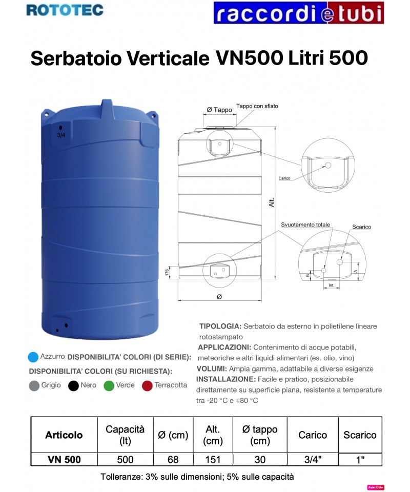TECHNISCHE DATENBLATT FÜR AUSSENBASIS (PANETTONE) VERTIGO Material: Außenbehälter aus einem Block aus linearer Polyethylen (LLDPE), rotomoldiert, ausgestattet mit einer PP-Schraubinspektionsklappe mit Entlüftung, mit angeformten Gewindeanschlüssen für Befüllung, Entleerung und vollständige Entleerung. Funktion: Behälter zur Lagerung von Trink- und Regenwasser sowie anderen Lebensmitteln. Die hohe Beständigkeit und die geringe Reaktivität des hochdichten Polyethylens ermöglichen die Verwendung der Behälter für die Lagerung verschiedener Flüssigkeitsarten (siehe „Kompatibilitätsdatenblatt des PE mit Flüssigkeiten“ auf www.rototec.it). Technische Merkmale: Die Tanks halten Temperaturschwankungen von -20 °C bis 80 °C stand, sie unterliegen im Laufe der Zeit keinen Verschlechterungen, und die verwendeten Materialien gewährleisten höchste Zuverlässigkeit in Bezug auf Korrosions- und Oxidationsprobleme. Die Struktur aus einem Block garantiert Robustheit und Festigkeit, da keine Schweißnähte vorhanden sind, die die Teile unter inneren Spannungen schwächen könnten. Aus Installationsgründen können Löcher in den Behältern an den entsprechenden Stellen gebohrt werden. Die glatten Oberflächen der Behälter ermöglichen eine einfache Wartung, das geringe Gewicht erleichtert den Transport und die Installation. Gebrauch und Wartung: Der Tank wird UNGEWAschen geliefert. Vor dem ersten Gebrauch das Innere mit Wasser und Reinigungsmittel oder flüssigem Geschirrspülmittel waschen und gegebenenfalls mit einem HACCP-Oberflächenreiniger behandeln. Schließlich gründlich mit Wasser abspülen. Anwendbare Vorschriften: Verordnung (EG) Nr. 1935/2004 des Europäischen Parlaments und des Rates vom 27. Oktober 2004 über Materialien und Gegenstände, die für den Kontakt mit Lebensmitteln bestimmt sind; Verordnung (EU) Nr. 10/2011 der Kommission vom 14. Januar 2011 über Materialien und Gegenstände aus Kunststoff, die für den Kontakt mit Lebensmitteln bestimmt sind; Verordnung (EU) 2020/1245 der Kommission vom 02.09.2020; Ministerialerlass vom 21. März 1973 über die hygienischen Vorschriften für Verpackungen, Behälter und Utensilien, die für den Kontakt mit Lebensmitteln oder mit persönlichen Gebrauchsgegenständen bestimmt sind; Verordnung (EG) Nr. 2023/2006 der Kommission vom 22. Dezember 2006 über gute Herstellungsverfahren für Materialien und Gegenstände, die für den Kontakt mit Lebensmitteln bestimmt sind (GMP); D.P.R. Nr. 777 vom 23.08.1982 und nachfolgende Aktualisierungen und Änderungen; Der Tank ist für die Lagerung von Lebensmitteln geeignet, gemäß den in der Konformitätsbescheinigung Nr. C1070-FPM-FDC-22_1 vom 25.07.2022, ausgestellt von CSI Spa - Mailand, angegebenen Grenzen. Verfügbare Farben: standardmäßig: blau; auf Anfrage: grün, schwarz, terrakotta, grau