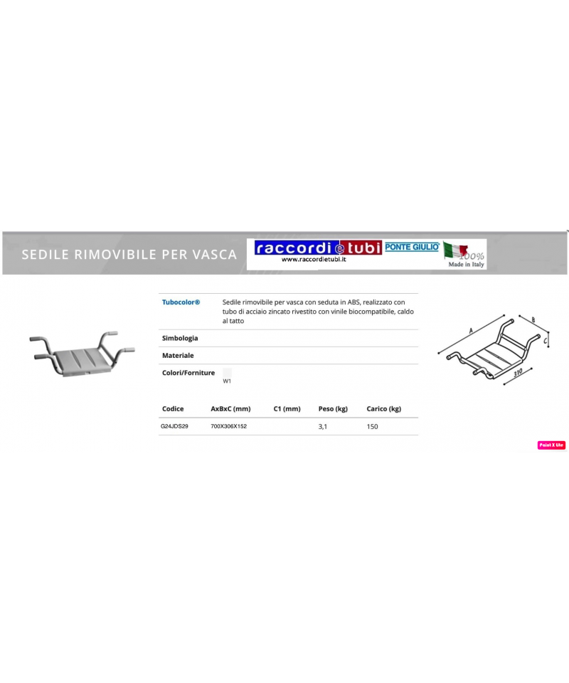 Klappsitz für die Dusche, hergestellt aus ABS mit einer Verstärkungsstruktur aus Stahl. Eine verstellbare mechanische Bremse ermöglicht es, den Sitz in jeder Position zu halten, um zu verhindern, dass er sich frei bewegt. Die spezielle Form ermöglicht es, wenig Platz zu beanspruchen, wenn er an die Wand geklappt wird.