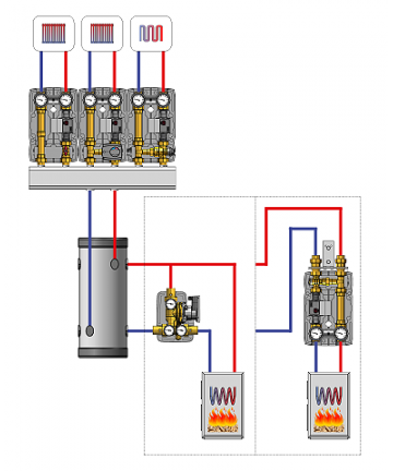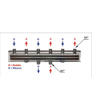 Isolierter Hydraulikseparator zum Anschluss vor dem Verteiler. Dieses Gerät ermöglicht die hydraulische Trennung des Primärkreises vom Sekundärkreis und sorgt für eine höhere Volumenströmung am Verteiler im Vergleich zu dem, was in der Therme zirkuliert. Besonders empfehlenswert in Verbindung mit Brennwertkesseln. Mit einer korrekten Regelung des Umwälzpumpen der Therme garantiert es eine niedrige Rücklauftemperatur (immer unter 57°C, der Kondensationstemperatur des Wasserdampfs im Erdgas) und erhöht die Effizienz der Anlage.