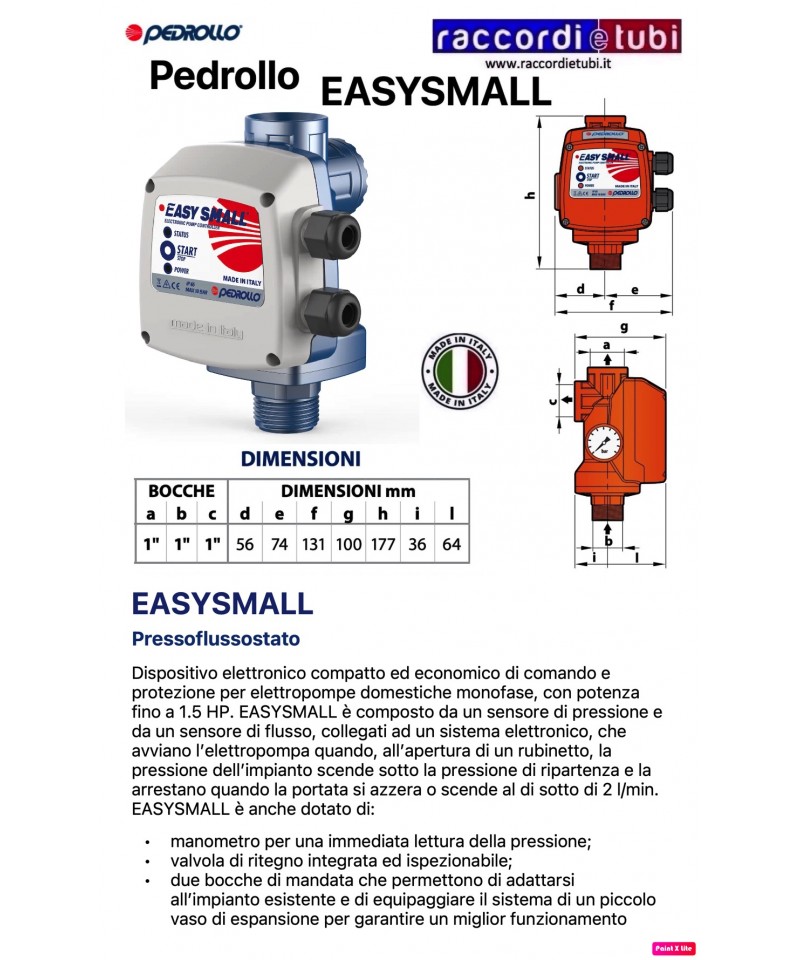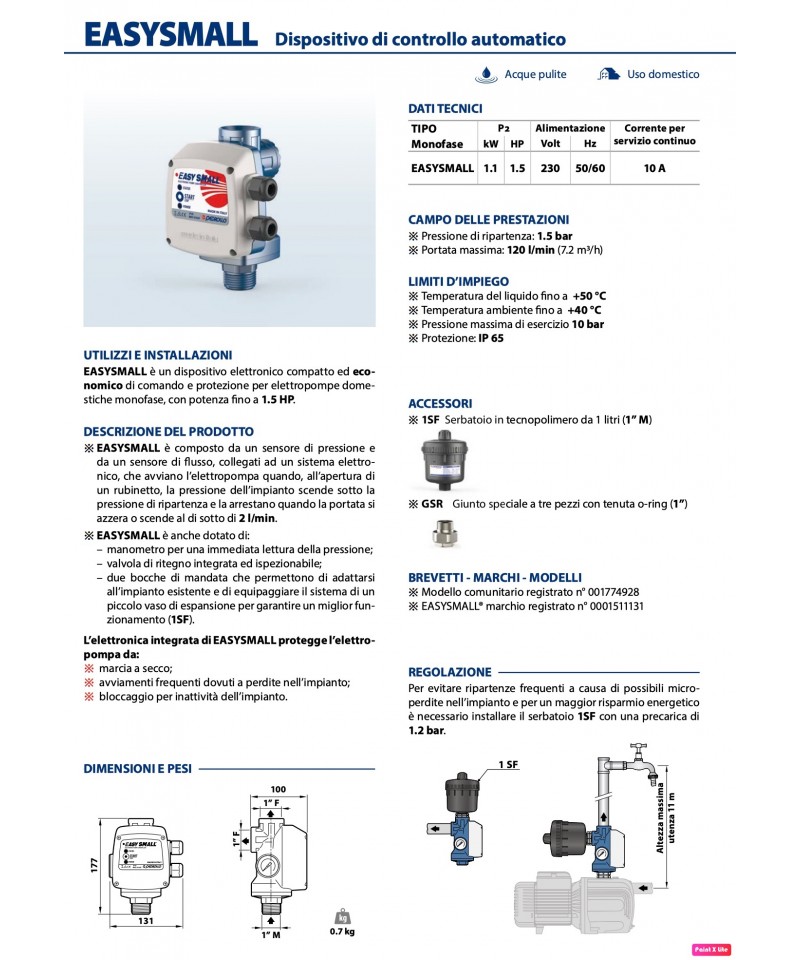 Dank des internen Sensors "RE-START 2HP" wird ein konstanter Durchfluss für den Einsatz bereitgestellt, um Schwankungen des Drucks zu vermeiden. Der interne Druckschalter, auf einen Druck von 1,5 bar (einstellbar) kalibriert, löst die automatische Inbetriebnahme der Elektropumpe aus und hält die Anlage unter Druck.