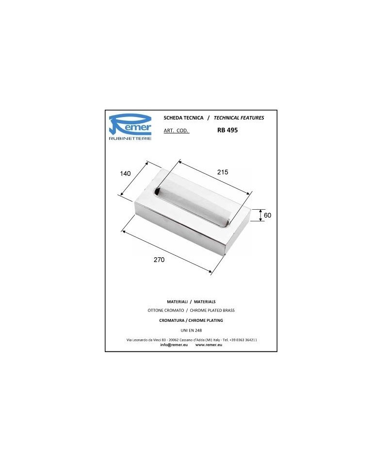 Il porta fazzoletti realizzato in ABS cromato è appositamente destinato per l'utilizzo in hotel, uffici, bagni, scuole ed ospedali. Il design, pur essendo semplice, risulta allo stesso tempo innovativo e si adatta perfettamente ad ogni tipo di arredamento. Remer, sinonimo di qualità e stile, dimostra la sua eccellenza attraverso la vasta rete di clienti acquisiti in tutto il mondo, in costante crescita.
