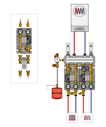 Modulo idraulico miscelato a 2 vie con valvola miscelatrice a 3 vie per impianti