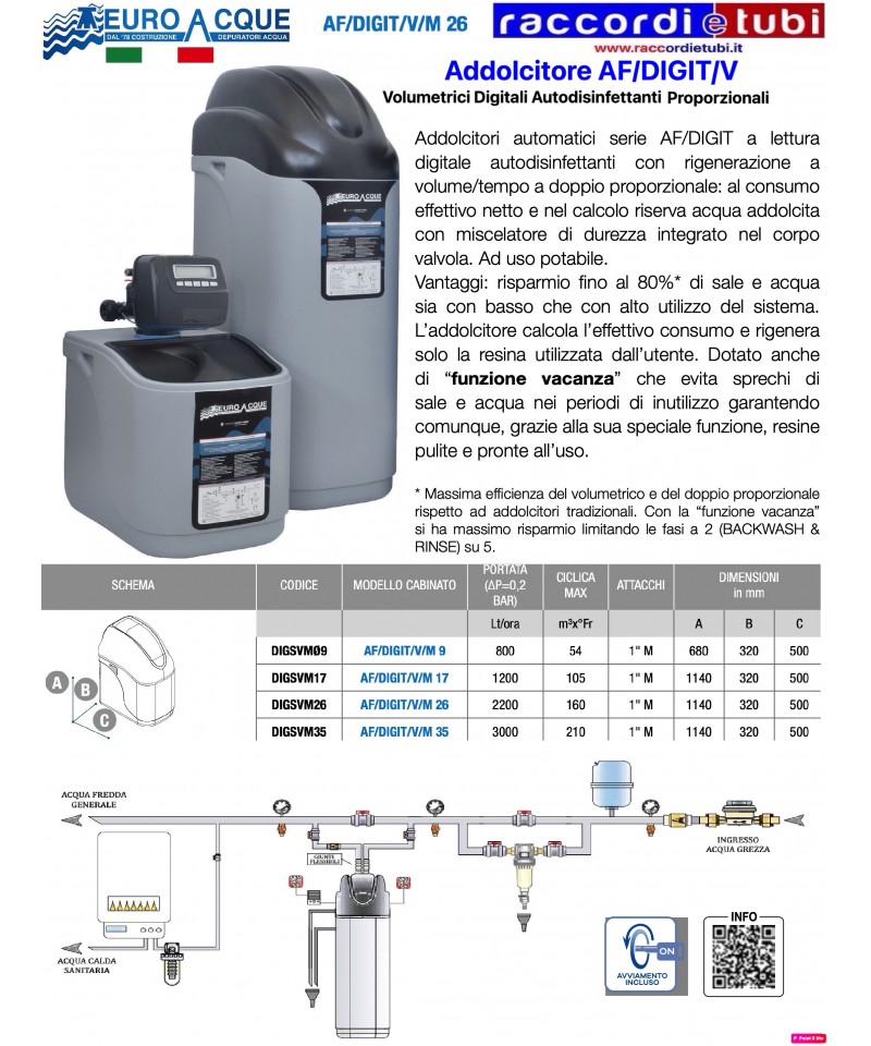 Addolcitori automatici VELVET a lettura digitale (display LCD a colori) con rigenerazione a volume/ tempo a doppio proporzionale: al consumo effettivo netto e nel calcolo riserva acqua addolcita con miscelatore di durezza & disinfezione integrati nel corpo valvola. Ad uso potabile. L’esclusivo sistema di servizio e dell’iniezione salamoia in controcorrente permette di sfruttare al 100% la resina contenuta all’interno della bombola. Vantaggi: risparmio fino al 80%* di sale e acqua sia con basso che con alto utilizzo del sistema. L’addolcitore calcola l’effettivo consumo e rigenera solo la resina utilizzata dall’utente. Rigenerazione con Tino del sale a secco. Dotato di “funzione vacanza” che evita sprechi di sale e acqua nei periodi di inutilizzo garantendo comunque, grazie alla sua speciale funzione, resine pulite e pronte all’uso. Con sensore esaurimento sale e doppio led utile per facilitare la lettura e per illuminare l’interno del cabinato in modo da poter visionare facilmente il livello sale.