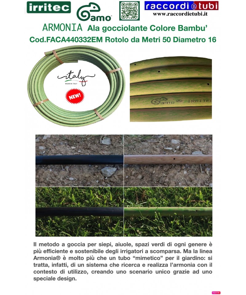 Ala gocciolante non autocompensante, spazziatura 15, massima lunghezza consigliata 6 mt per mantenere l'omogeneità di portata. Filtrazione consigliata 120 mesh di colore marrone.