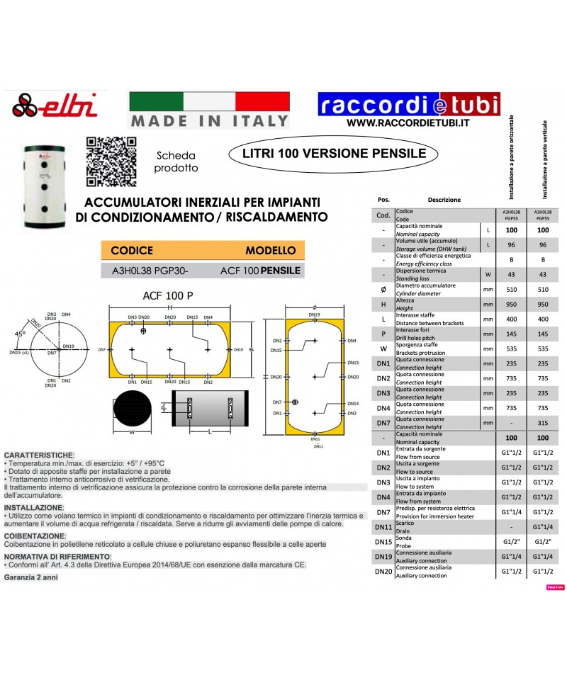 Accumulo inerziale Space Mut in acciaio decapato verniciato, coibentato per impianti ibridi e pompe di calore, con 4 o 6 attacchi principali da 1”¼ femmina. • Valvola a sfera di scarico G¾” Ottone CW617N (EN 12165) • Valvola di sfiato automatico G¾” Ottone CW617N (EN 12165) • Corpo accumulo inerziale: acciaio decapato verniciato • Fluidi d’impiego: acqua e soluzioni glicolate secondo UNI8065:2019 / VDI2035 (% max glicole=50%). • Pressione massima di esercizio: 6 bar. • Campo di temperatura di esercizio 0÷100°C. • Coibentazione: guscio preformata a caldo in PE-X espanso a celle chiuse spessore 15 mm. Campo di temperatura di esercizio -40÷130 °C