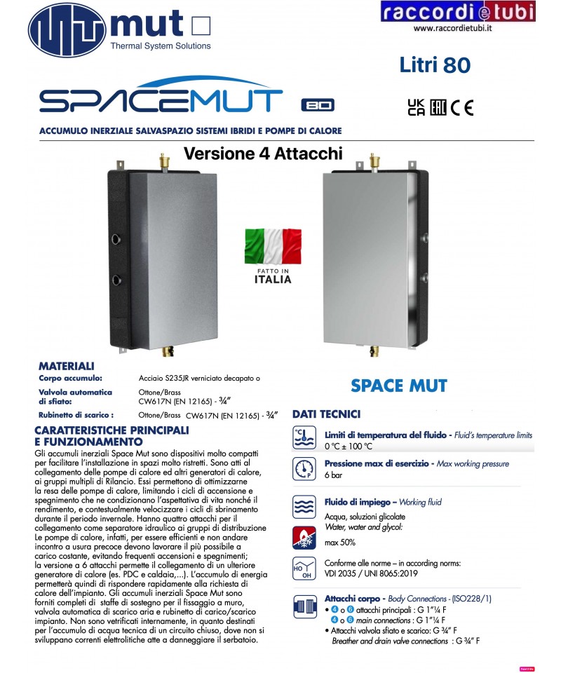 Separatore idraulico/disaeratore/defangatore MUT serie ECO. Versione INOX 304 FX” con connessioni filettate maschio: • 1” M ( FX 7.030.03296) • 1”¼ M (cod.FX 7.030.03297) • 1”½ M FX 7.030.03298) • 2” M FX 7.030.03297 in Acciaio AISI 304L. Fluidi di impiego acqua, soluzioni glicolate. Massima percentuale di glicole 50%. Pressione massima di esercizio 10 bar. Campo di temperatura di esercizio 0÷110 °C. FORNITO DI: • Valvola automatica di sfogo aria con corpo in ottone UNI EN 12165 CW 617 N • Tenute idrauliche in EPDM/VITON • Valvola di scarico a sfera con corpo in ottone UNI EN 12165 CW 617 N • Attacco portasonda frontale 1/2” F Guscio di coibentazione in Polietilene espanso a celle chiuse sp. 12 mm