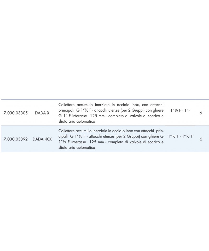 Accumulo inerziale Space Mut in acciaio INOX 304, coibentato per impianti ibridi e pompe di calore, con 4 o 6 attacchi principali da 1”¼ femmina. • Valvola a sfera di scarico G¾” Ottone CW617N (EN 12165) • Valvola di sfiato automatico G¾” Ottone CW617N (EN 12165) • Corpo accumulo inerziale: acciaio decapato verniciato • Fluidi d’impiego: acqua e soluzioni glicolate secondo UNI8065:2019 / VDI2035 (% max glicole=50%). • Pressione massima di esercizio: 6 bar. • Campo di temperatura di esercizio 0÷100°C. • Coibentazione: guscio preformata a caldo in PE-X espanso a celle chiuse spessore 15 mm. Campo di temperatura di esercizio -40÷130 °C.