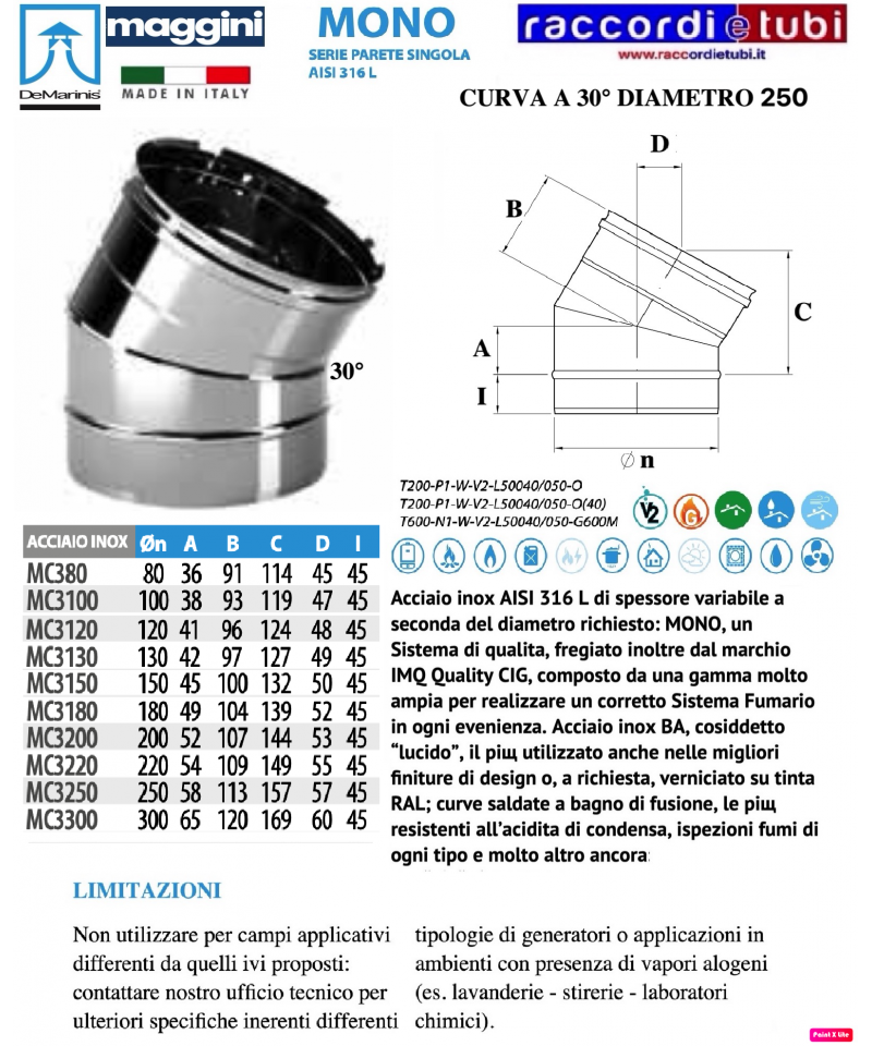 Acciaio inox AISI 316 L di spessore variabile a seconda del diametro richiesto: MONO, un Sistema di qualità, fregiato inoltre dal marchio IMQ Quality CIG, composto da una gamma molto ampia per realizzare un corretto Sistema Fumario in ogni evenienza. Acciaio inox BA, cosiddetto “lucido”, il più utilizzato anche nelle migliori finiture di design o, a richiesta, verniciato su tinta RAL; curve saldate a bagno di fusione, le più resistenti all’acidità di condensa, ispezioni fumi di ogni tipo e molto altro ancora: chiedi ai nostri uffici maggiori informazioni.