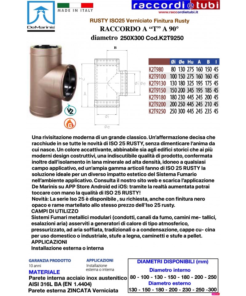 Elementi componibili rigidi doppia parete Sistema ISO 25 RUSTY con qualità e finiture della parete esterna verniciato “Rusty” per De Marinis S.r.l., realizzati con parete interna in acciaio inox AISI 316 L di spessore minimo 0,4 mm e parete esterna in lamiera zincata di spessore 0,5 mm, rispondenti agli standard previsti dalla marcatura europea CE secondo normativa EN 1856-1 2009, aventi requisiti di designazione T200-P1-W-V2-L50040-O40 per applicazioni con guarnizione, in alternativa, per applicazioni senza guarnizione di tenuta, aventi designazione T600-N1-W-V2-L50040-G85 secondo i medesimi standard sopra descritti. Coibentazione realizzata in lana minerale ad alta densità di spessore 25 mm, pressata ed interposta tra le pareti senza elementi di giunzione tra le stesse (ponte termico).