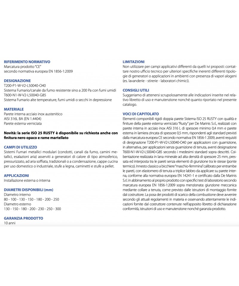 Elementi componibili rigidi doppia parete Sistema ISO 25 RUSTY con qualità e finiture della parete esterna verniciato “Rusty” per De Marinis S.r.l., realizzati con parete interna in acciaio inox AISI 316 L di spessore minimo 0,4 mm e parete esterna in lamiera zincata di spessore 0,5 mm, rispondenti agli standard previsti dalla marcatura europea CE secondo normativa EN 1856-1 2009, aventi requisiti di designazione T200-P1-W-V2-L50040-O40 per applicazioni con guarnizione, in alternativa, per applicazioni senza guarnizione di tenuta, aventi designazione T600-N1-W-V2-L50040-G85 secondo i medesimi standard sopra descritti. Coibentazione realizzata in lana minerale ad alta densità di spessore 25 mm, pressata ed interposta tra le pareti senza elementi di giunzione tra le stesse (ponte termico).