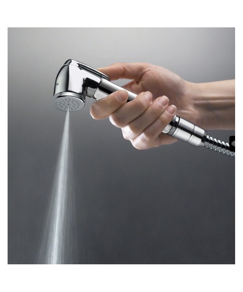 Set composto da: doccetta quadrata in ABS (1412009), presa d’acqua centrale quadrata (1409007), flessibile PVC silver 150 cm. (1407003)