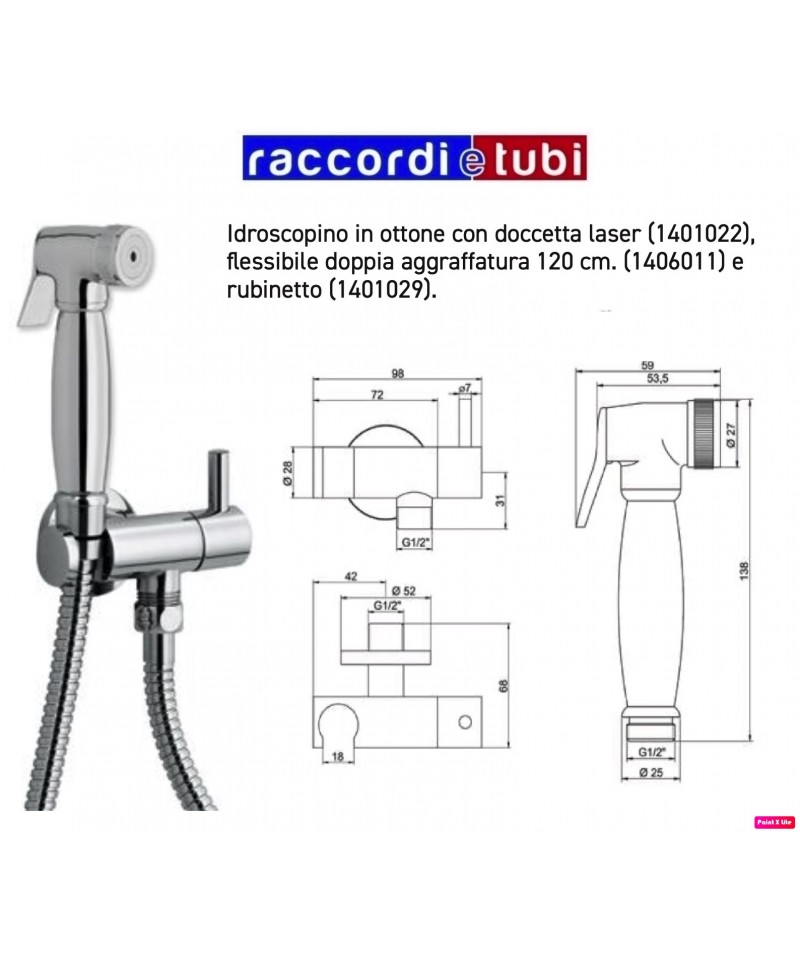 Idroscopino in ottone con doccetta laser (1401022), flessibile doppia aggraffatura 120 cm. (1406011) e rubinetto (1401029).