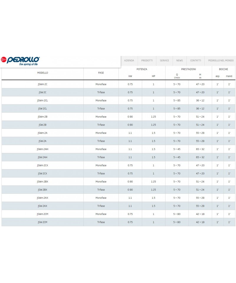 Esecuzione Elettropompe centrifughe monoblocco autoadescanti con eiettore incorporato. NG: versione con corpo pompa e raccordo in ghisa. B-NG: versione con corpo pompa e raccordo in bronzo. Le pompe in bronzo vengono fornite completamente verniciate. Impieghi Per l’approvvigionamento d’acqua con aspirazione da pozzi. Per aumentare la pressione disponibile da una rete di distribuzione (osservare le disposizioni locali). Per liquidi puliti o acqua di superficie leggermente sporca. Per giardinaggio. Per lavaggi con getto d’acqua. Limiti d’impiego Temperatura liquido fino a 40 °C. Temperatura ambiente fino a 40 °C. Pressione finale massima ammessa nel corpo pompa 10 bar. Servizio continuo. Motore Motore ad induzione a 2 poli, 50 Hz (n = 2900 1/min). NG: trifase 230/400 V ± 10%. NGM: monofase 230 V ± 10%, con termoprotettore. Condensatore inserito nella scatola morsetti. Isolamento classe F. Protezione IP 54. Motori trifasi con classe di efficienza IE3 (IE2 fino a 0,65 kW). Esecuzione secondo EN 60034-1; EN 60034-30-1. EN 60335-1, EN 60335-2-41.