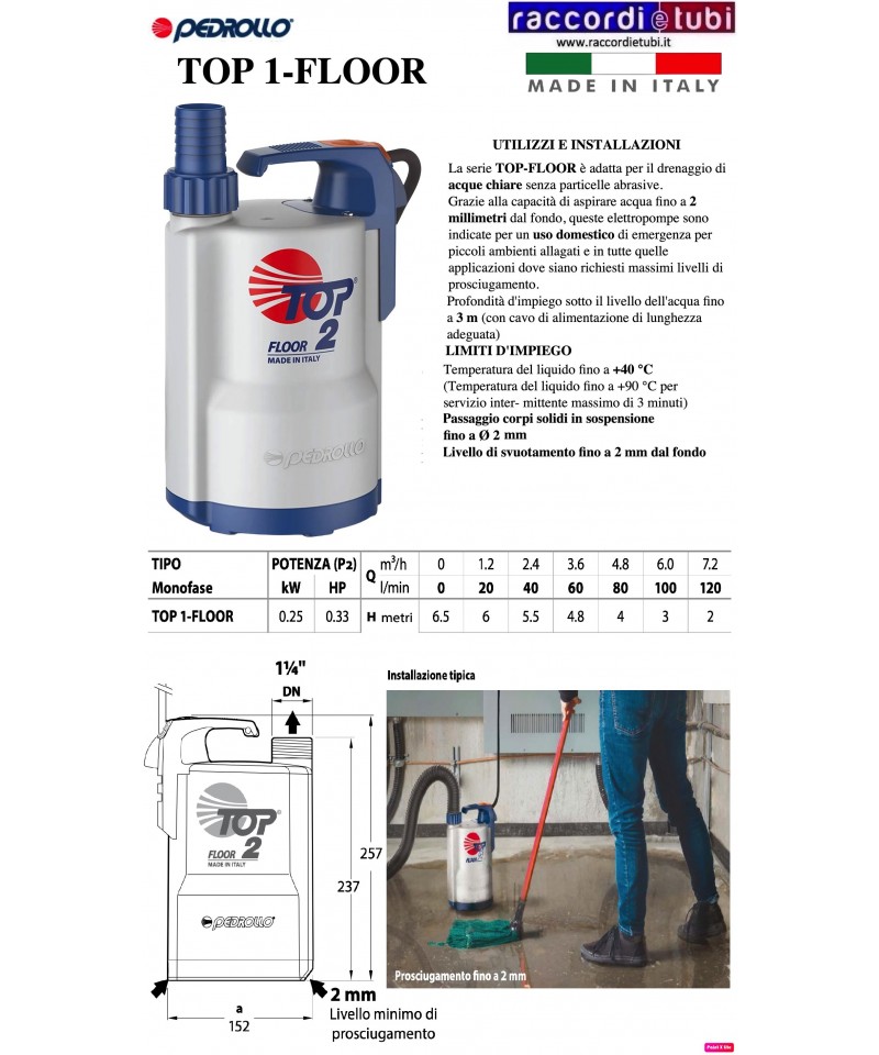 ELETTROPOMPA PEDROLLO AD IMMERSIONE TOP2 MT.5 CAVO