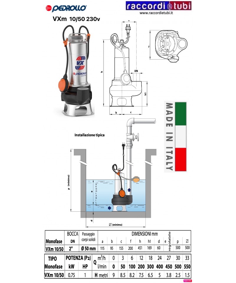 1 HP PORTATA 50/300 LITRI/MIN. PREVALENZA 9.5/2 MT