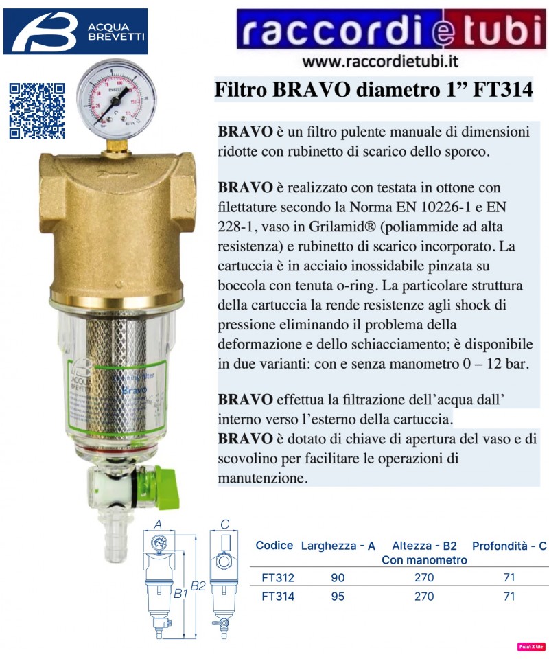BRAVO è un filtro pulente manuale di dimensioni ridotte con rubinetto di scarico dello sporco. BRAVO è realizzato con testata in ottone con filettature secondo la Norma EN 10226-1 e EN 228-1, vaso in Grilamid® (poliammide ad alta resistenza) e rubinetto di scarico incorporato. La cartuccia è in acciaio inossidabile pinzata su boccola con tenuta o-ring. La particolare struttura della cartuccia la rende resistente agli shock di pressione eliminando il problema della deformazione e dello schiacciamento; è disponibile in due varianti: con e senza manometro 0 - 12 bar. BRAVO effettua la filtrazione dell’acqua dall’ interno verso l’esterno della cartuccia. BRAVO è dotato di chiave di apertura del vaso e di scovolino per facilitare le operazioni di manutenzione. Per la manutenzione e gli interventi di sanificazione è possibile rivolgersi ai Centri Assistenza Autorizza.
