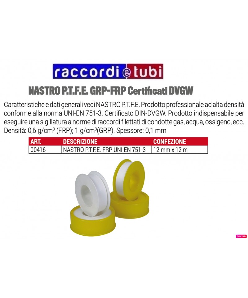 Caratteristiche e dati generali vedi NASTRO P.T.F.E. Prodotto professionale ad alta densità conforme alla norma UNI-EN 751-3. Certificato DIN-DVGW. Prodotto indispensabile per eseguire una sigillatura a norme di raccordi filettati di condotte gas, acqua, ossigeno, ecc. Densità: 0,6 g/cm3 (FRP)