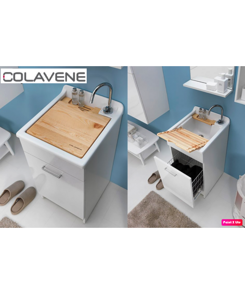 Mobile in truciolare nobilitato 18 mm. Idrofugo a norme EN, frontale in laminato lucido. Dotazione: fornito completo di cestello portabiancheria e griglia, tavola in legno massello, lavatoio in ABS metacrilato, sifone e troppopieno, maniglie cromate.