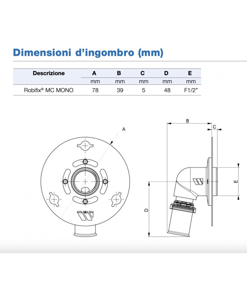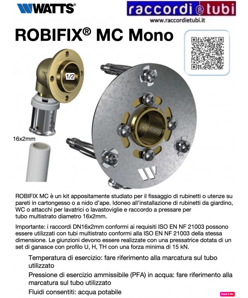 Kit di fissaggio per rubinetteria su pareti in cartongesso e tubo multistrato, Serie ROBIFIX® MC - marca WATTS, idoneo all’installazione di WC, attacchi per lavatrici, lavastoviglie. Il kit comprende: piastra per ROBIFIX® mono foro (80X86mm), gomito in ottone per tubo multistrato Ø16x2 a pinzare (profilo U-H-TH) e attacco F1/2” conforme ai requisiti ISO EN NF21003, 4 tasselli e 4 viti di fissaggio.