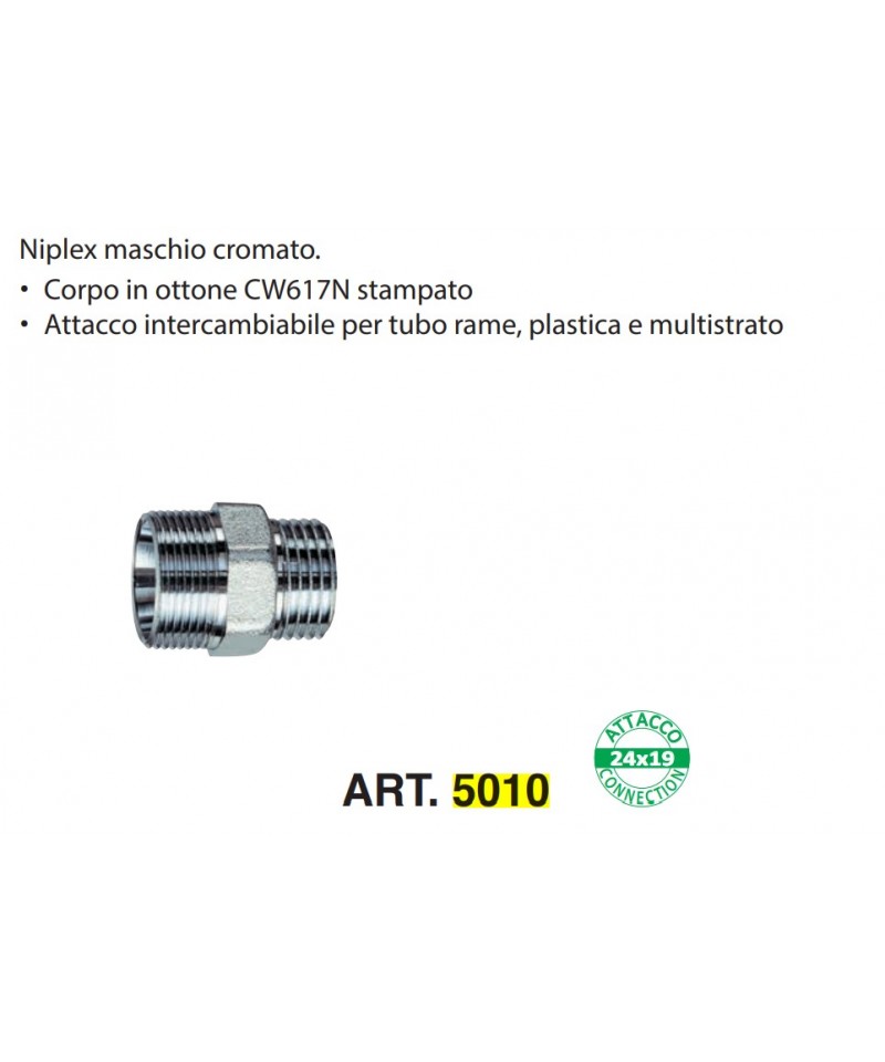 Niplex maschio cromato. • Corpo in ottone CW617N stampato • Attacco intercambiabile per tubo rame, plastica e multistrat