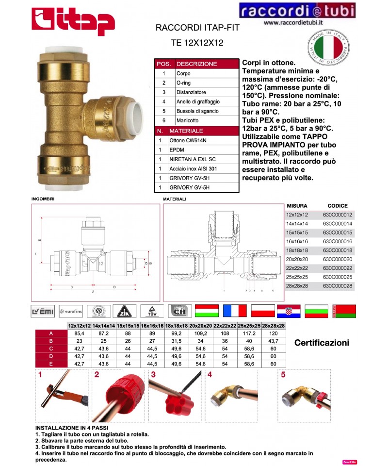 Tubo rame: 20 bar a 25°C, 10 bar a 90°C.