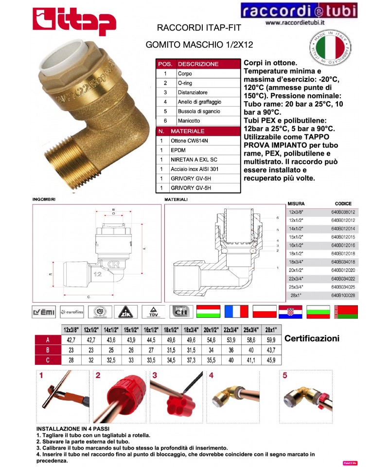 Gomito maschio 1/2x12 per tubo rame, PEX, polibutilene e multistrato.