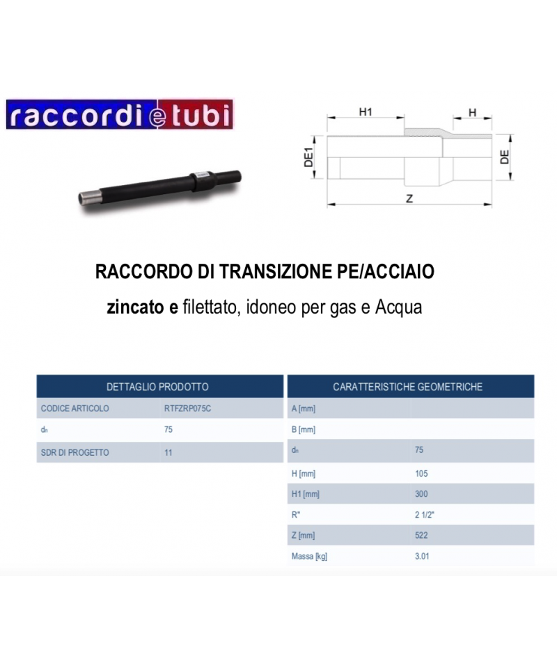 Principali caratteristiche: categoria dei raccordi di transizione; PE100 nero e acciaio; SDR 11; acciaio rivestito in polietilene e zincato; filettato; esecuzione stampata.