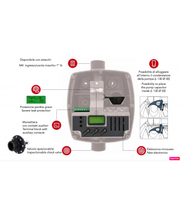 Tra le caratteristiche più importanti spicca quella di salvaguardare il motore della pompa da marcia a secco e avviamenti ripetuti dovuti a perdite nell'impianto idrico.
